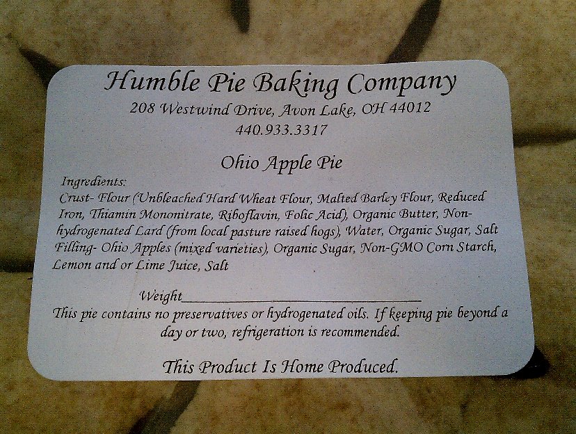 After dinner, we cleaned up the kitchen and gave ourselves a chance to digest before turning to dessert. Here was a shot of the label on the apple pie I had purchased at the market earlier:
